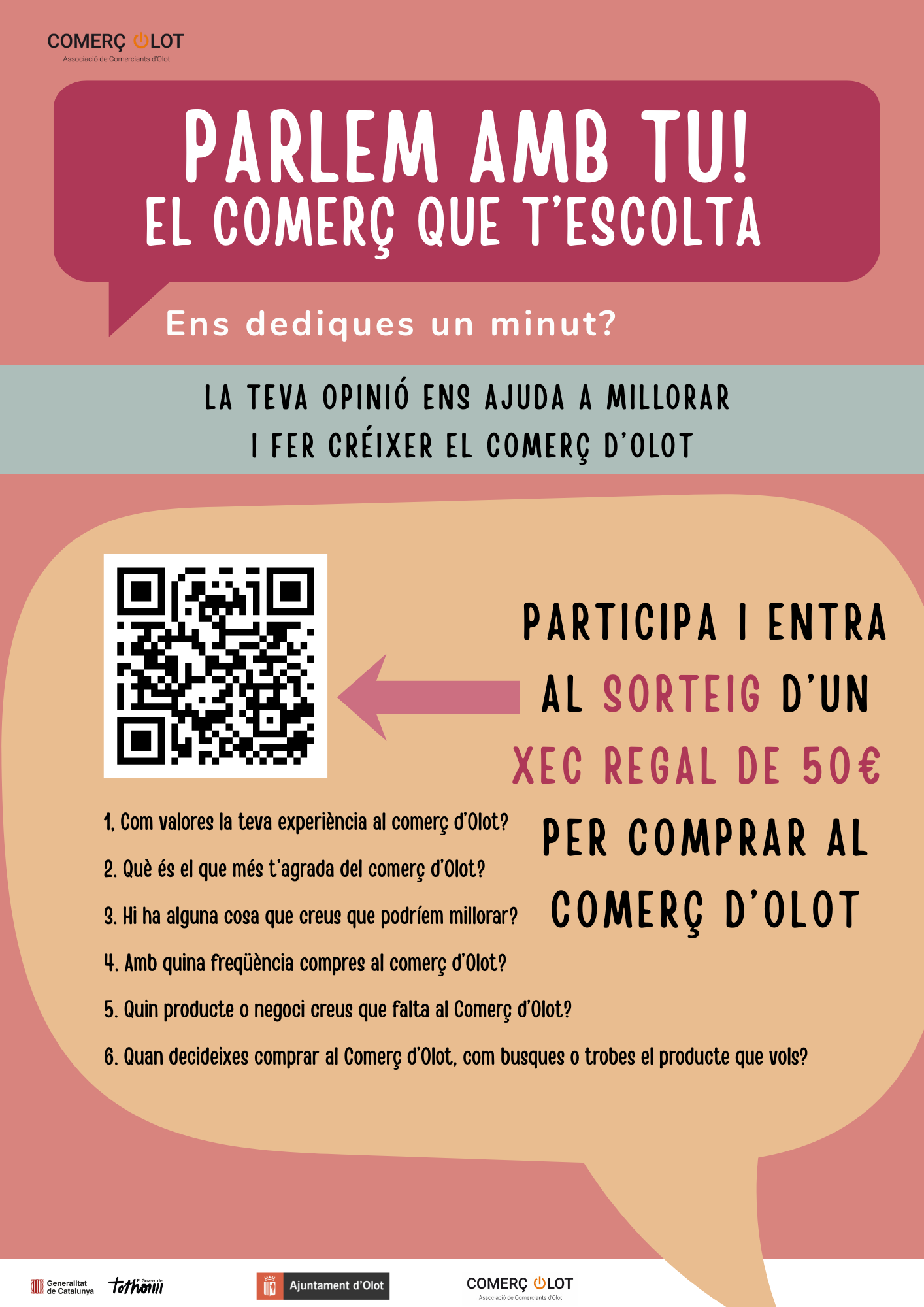 Per incentivar la participació, totes les persones que responguin l’enquesta entraran al sorteig d’un xec regal de 50 euros per gastar als establiments del Comerç d’Olot.